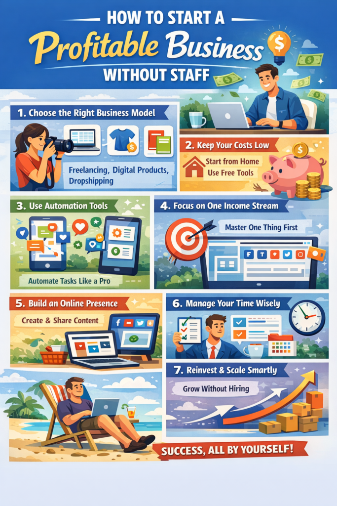 Starting a profitable business without staff is not only possible — it’s powerful. You maintain full control, reduce risk, and keep more of your profits.